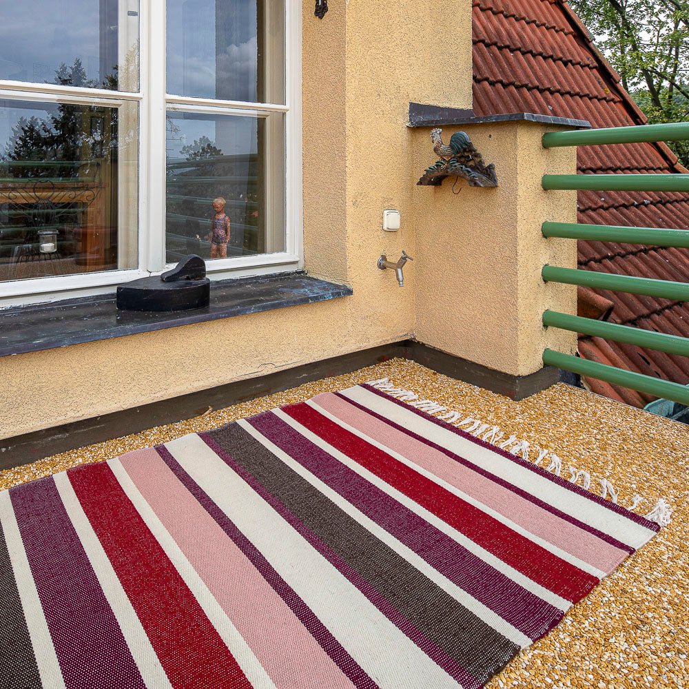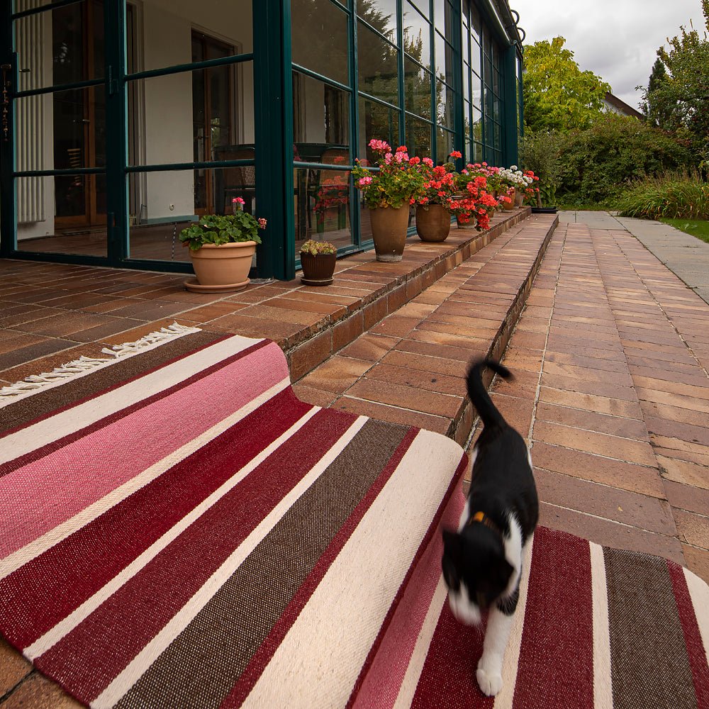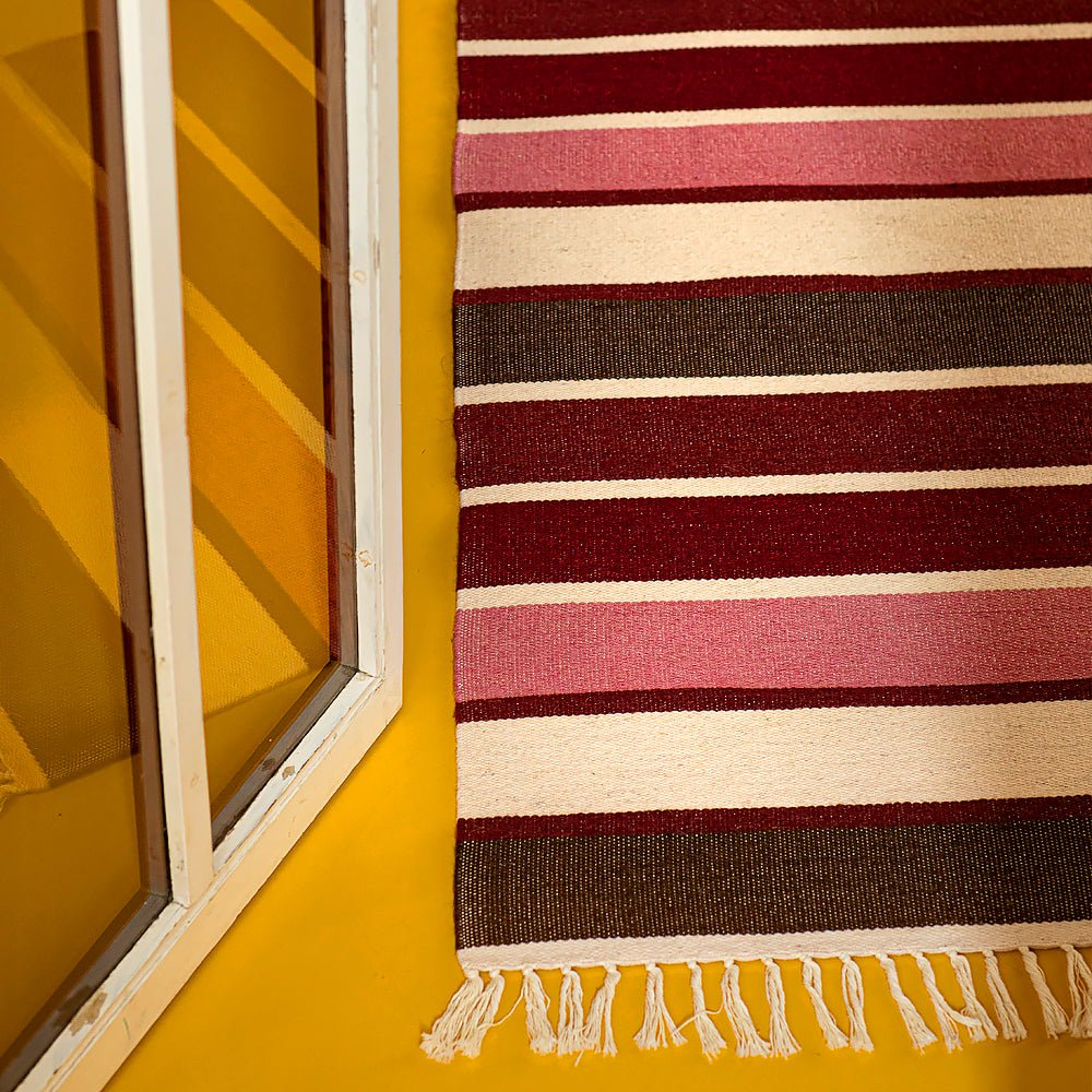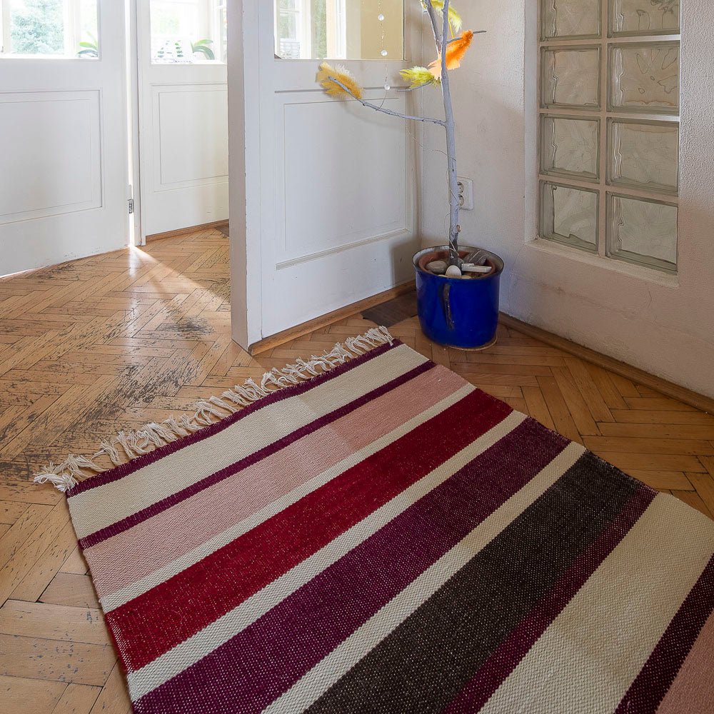 Ένας μακρύς δρομέας από μαλλί σε βαμβακερό στημόνι με ρίγες σε έναν γοητευτικό συνδυασμό μπορντό, μαύρων και ροζ αποχρώσεων που θα κάνει το εσωτερικό σας άνετο. Όταν η μία πλευρά του λερωθεί, μη διστάσετε να το γυρίσετε ανάποδα. Και όταν το ίδιο συμβεί και στην άλλη πλευρά, βάλτε το στο πλυντήριο! Θα κάνει τη δουλειά του!