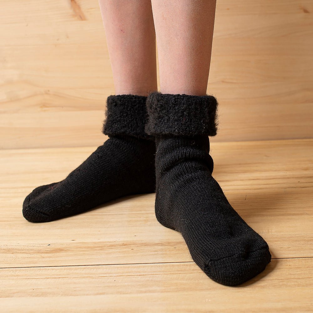 Ζεστές χοντρές μάλλινες κάλτσες με ζεστή γούνα στο εσωτερικό τους. Λόγω του πάχους τους είναι ιδιαίτερα κατάλληλες για το σπίτι. Για τον ύπνο, θα εκτιμηθούν από τα ψυχρά άτομα. Αυτές είναι σε πρακτικό μαύρο χρώμα.