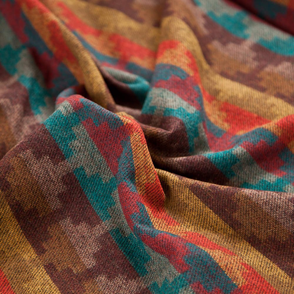A beautiful wool fabric with an interesting pattern that is warm to the eye. Brown, orange, grey and blue shades that complement each other harmoniously. Suitable, for example, for a distinctive autumn and winter coat.