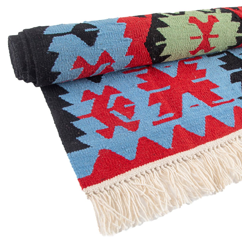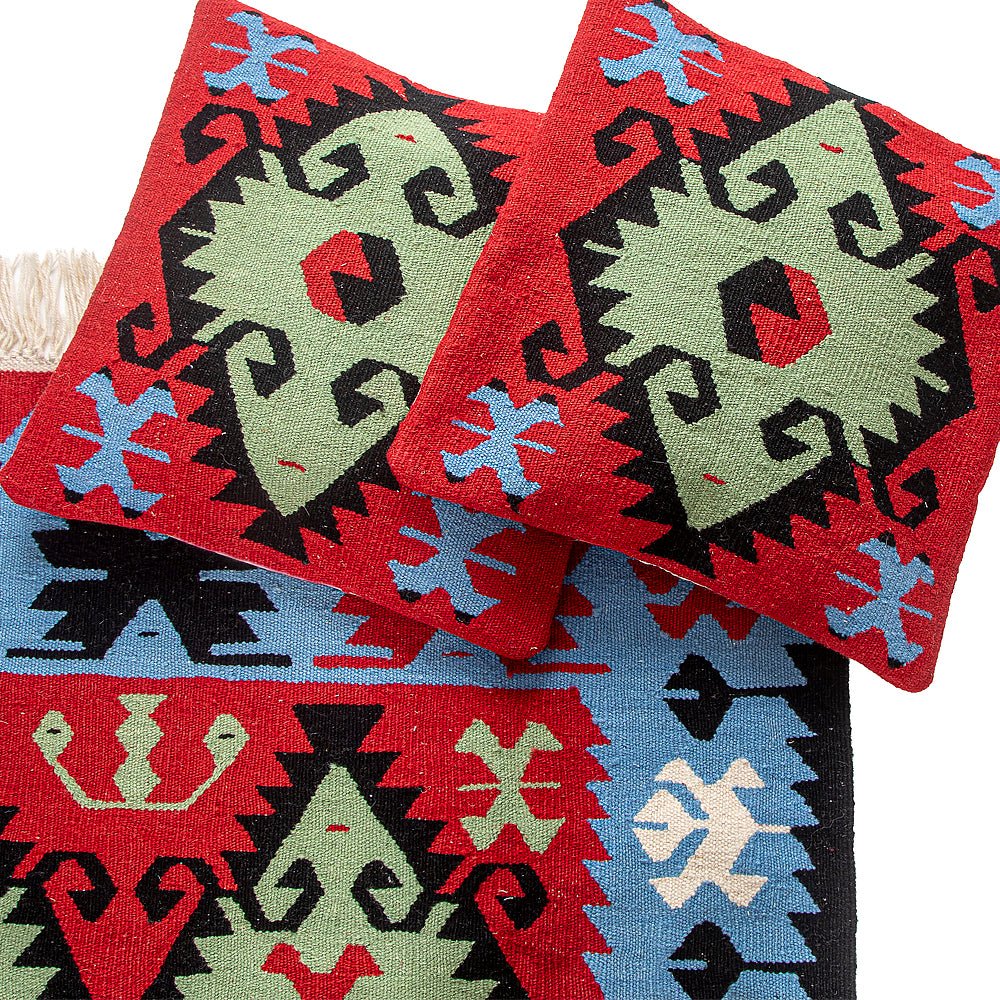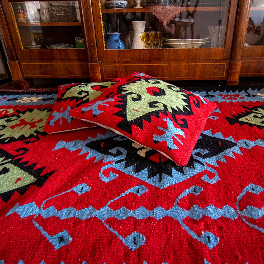 Here we experimented a bit and created a kilim with a traditional pattern originating from Eastern Bulgaria. However, we had the kilim made by our kilim makers in Turkey, so local slightly thicker naturally dyed yarns were used to weave it. The resulting creation is thus a combination of Balkan and Anatolian kilims!
