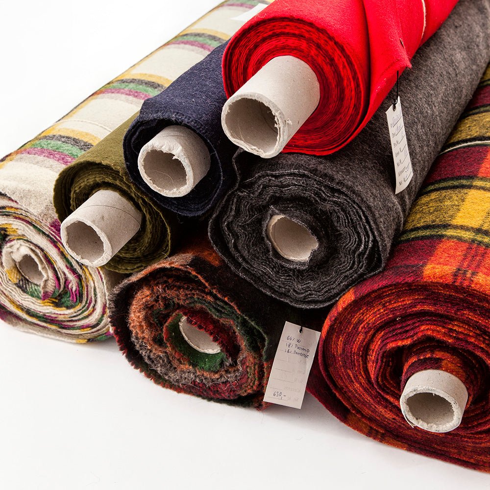 Jantra 6.11 is a grey wool fabric with light and dark yellow stripes. Its texture makes it perfect for a coat, for example. This pattern resembles the classic patterns of our Rodopa blankets.