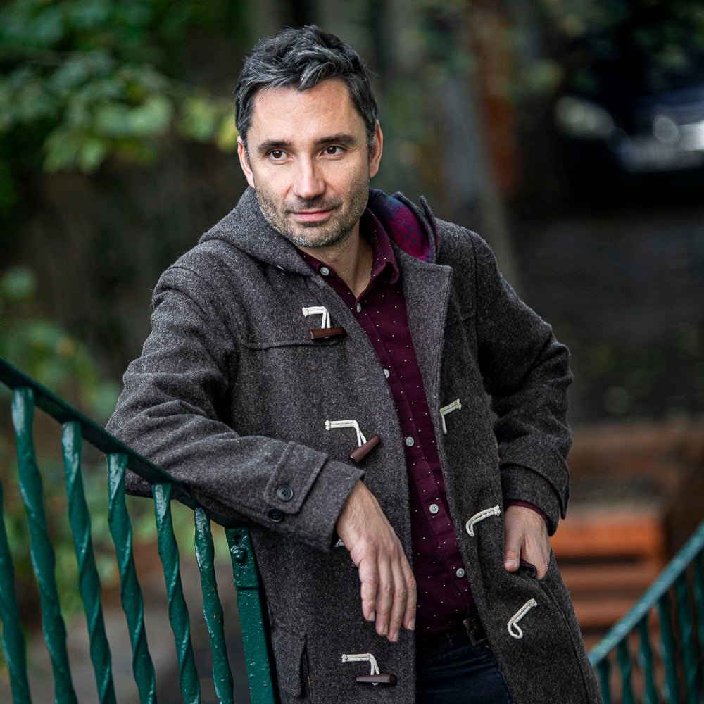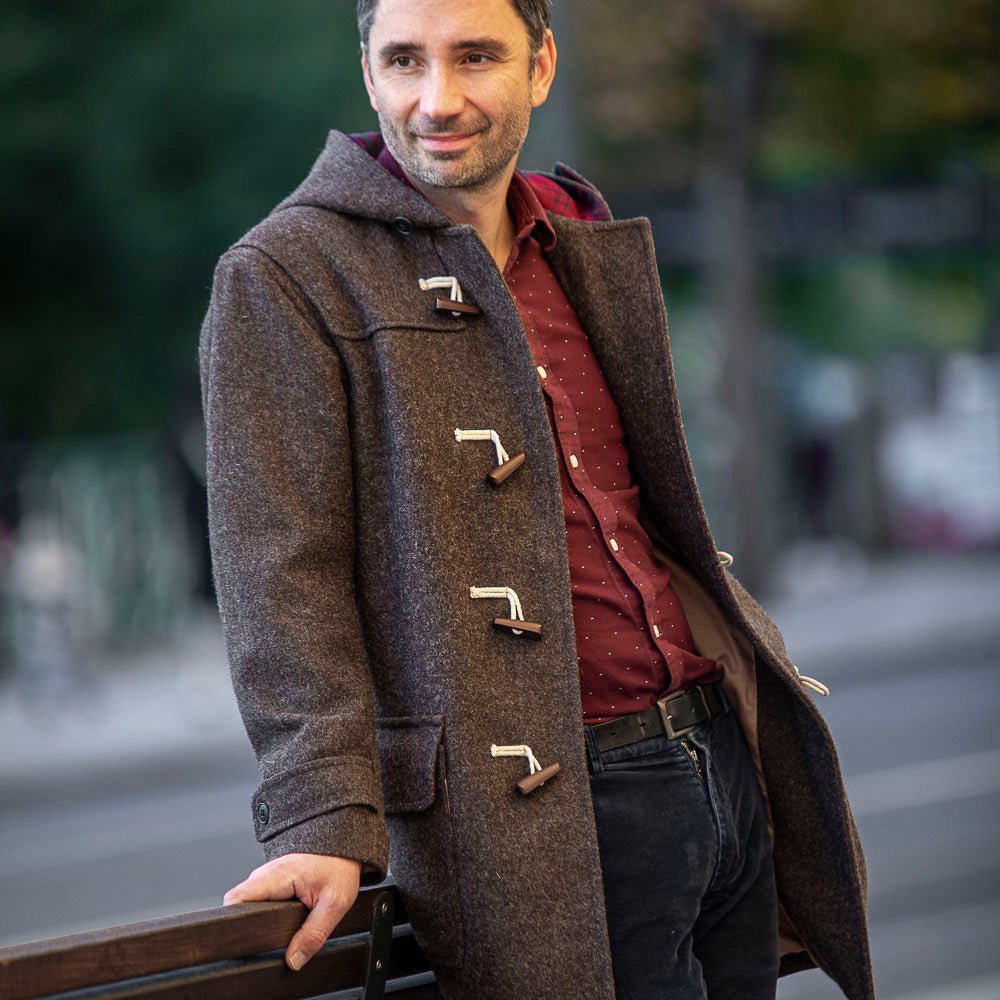 The coat is made of Marica (100% wool) and Karadere (100% wool) fabric, the lining is cotton satin. The Montgomery I is mid-thigh length. It fastens with four wooden toggles, the hood is secured with a buckle and buttons.