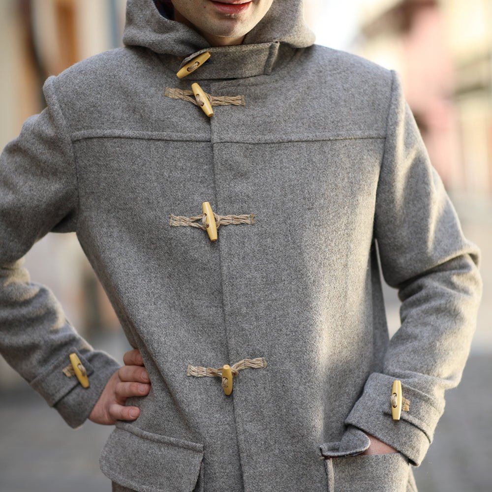 The coat is made of Marica top fabric (100% wool) and Karadere bottom fabric (100% wool), the lining is cotton satin. The Montgomery II coat is below the knee. It fastens with four wooden toggles, the hood is secured with a buckle and buttons.