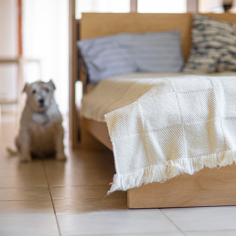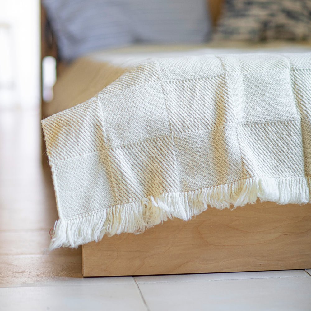 Rodopa Merino in the size 200 x 220 is suitable as a bedspread over your bed or sofa. The blanket is made of the finest Merino wool. Merino is an old European breed of sheep - the wool used to make this blanket comes from Spain and Hungary. From there it is imported in its raw state to Bulgaria, where it is woven into these very fine blankets, which are an alternative to the equally woven and slightly coarser blankets made from the local Rhodope wool. The Rodopa Merino blanket is made in the same way as Rodopa II. The individual blocks on the blanket are slightly embossed, which makes for a very interesting combination with the simple natural color of the blanket. This blanket is undyed and combines the elegance of a timeless pattern with a premium natural material. It is a higher weight blanket, so it can be used as a warm blanket or a throw over a double bed or divan with a simple yet eye-catching aesthetic.