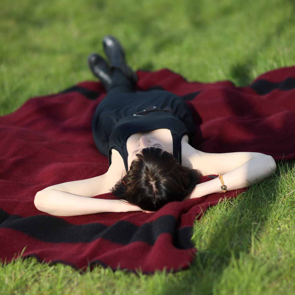 The blanket is thick and warm, ideal for camping. It has a dark burgundy colour, which is very practical for outdoor use, and one black stripe at each edge. It is a replica of blankets made specifically for North American Indians. Wool blankets with these designs were the most desirable items in the fur trade between the Indians and the European settlers of North America.