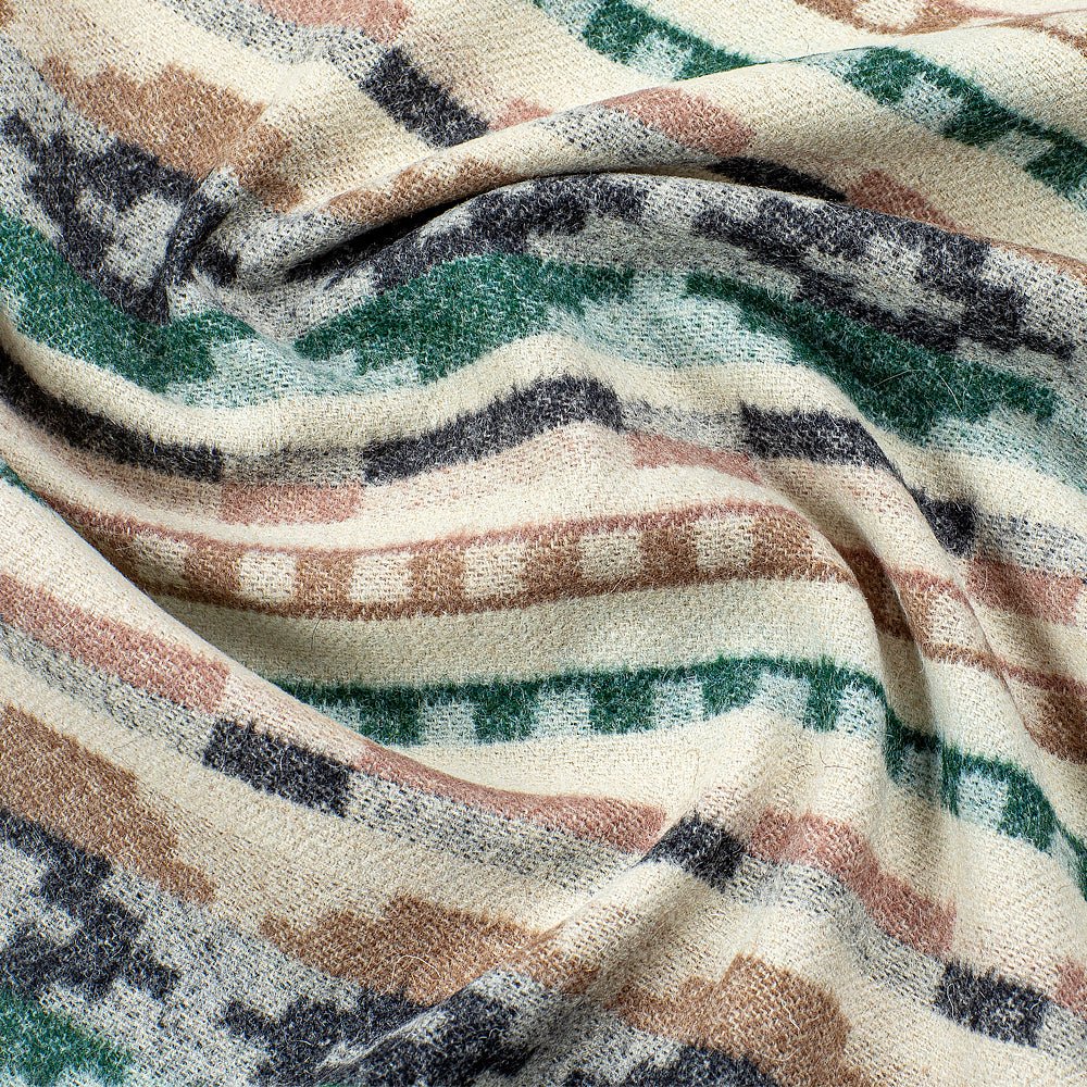 Vlnená látka s jemným farebným vzorom v bielych, sivých, zelených a hnedých prekrývajúcich sa odtieňoch. Stredná gramáž. Vhodná napríklad na výrobu kabáta.