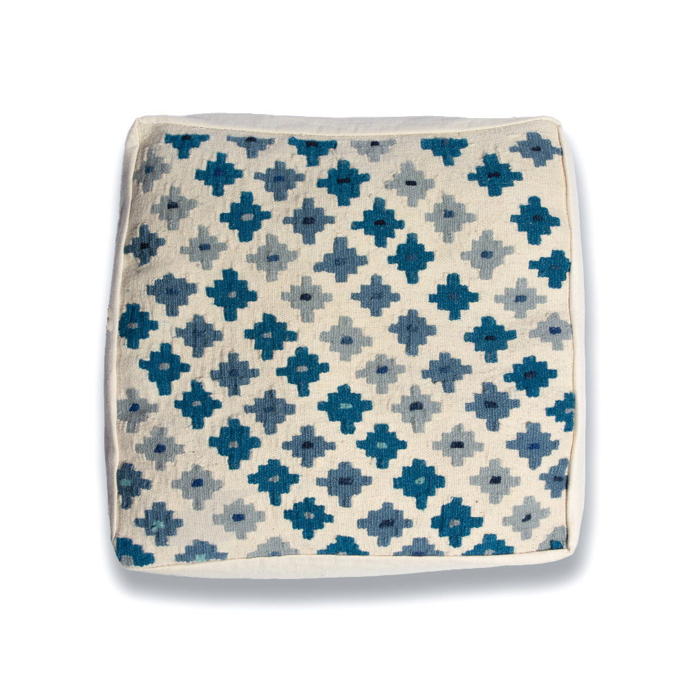 Vankúš s farebným lemovaním vyrobený technikou ručného tkania, s pevným bavlneným plátnom na prednej a zadnej strane a otvorom na zips na vloženie vnútornej výplne. Tá nie je súčasťou vankúša.